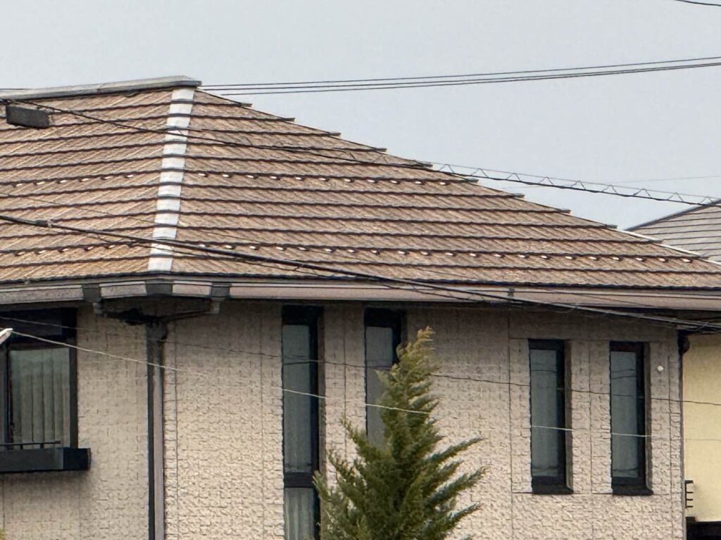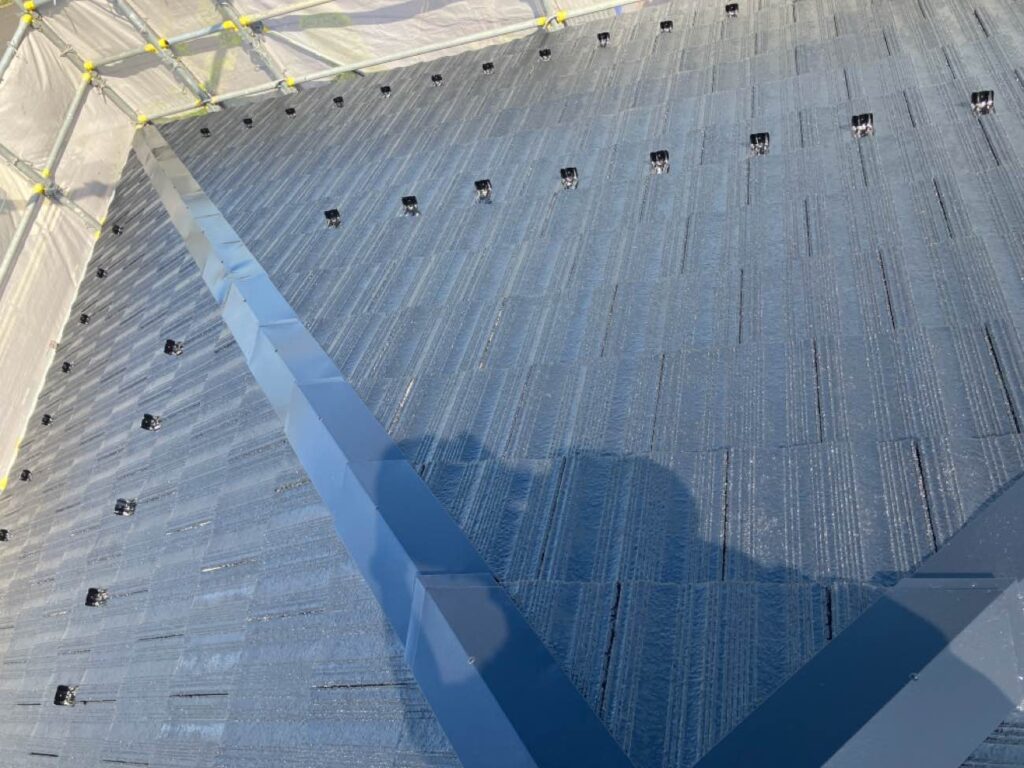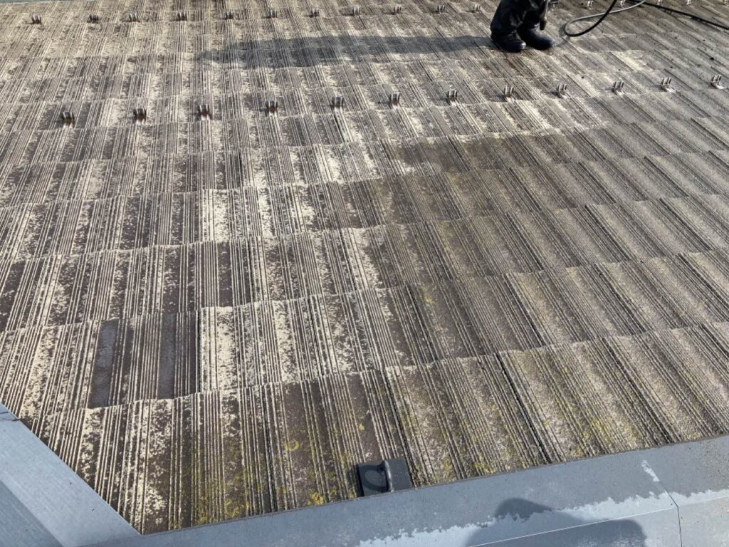 セメント系の屋根材は塗料の吸い込みが大きい為、しっかり色がつくまで塗り重ねます。