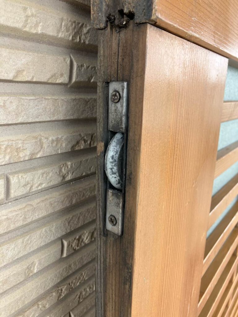 現地で確認させていただいたところ、原因は扉本体ではなく、下部の戸車の摩耗でした。