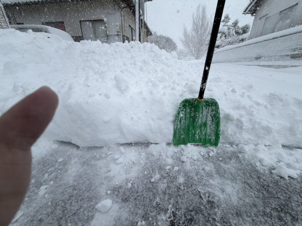 雪かきして増えた分を加味したとしても、スコップの部分をはるかに超える高さまで雪が積もっていました。
