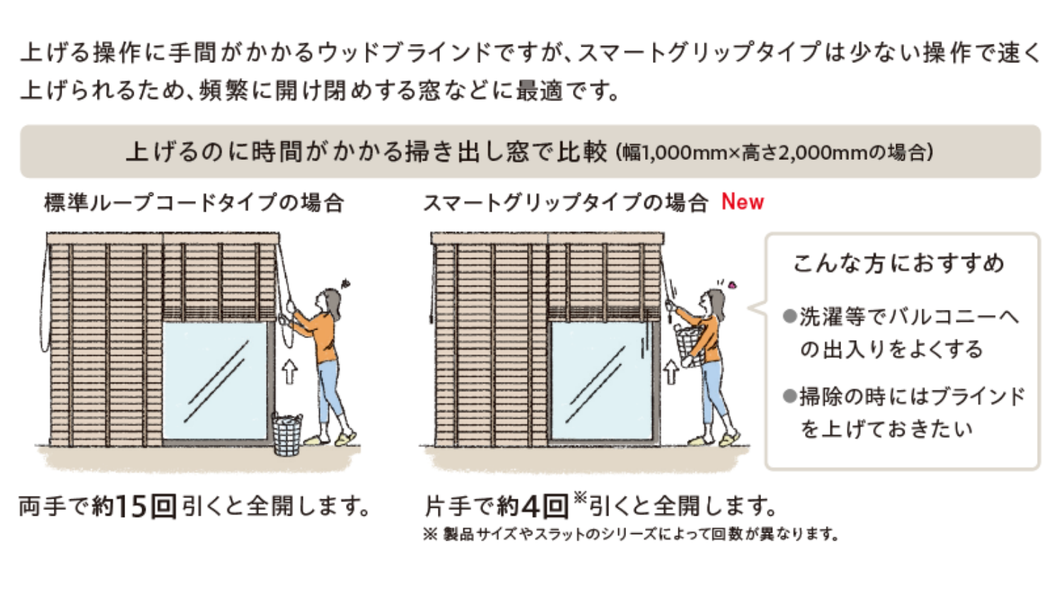 使用感で操作性について記載しましたが、ブラインドを全上げする際は時間がかかります。めったに全部上げることはないので負担に思うことはなかったのですが、この度「片手でスマートにらく早操作」の新しいウッドブラインドが登場!スマートグリップと操作性が画期的↓↓↓