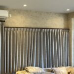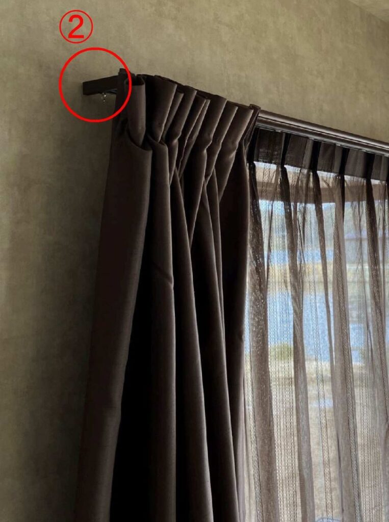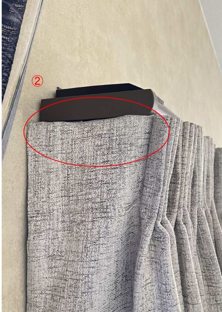 ②カーテンレールを側面を覆うリターン専用レールを取付け、カーテンもリターン縫製すき間をシャットアウト