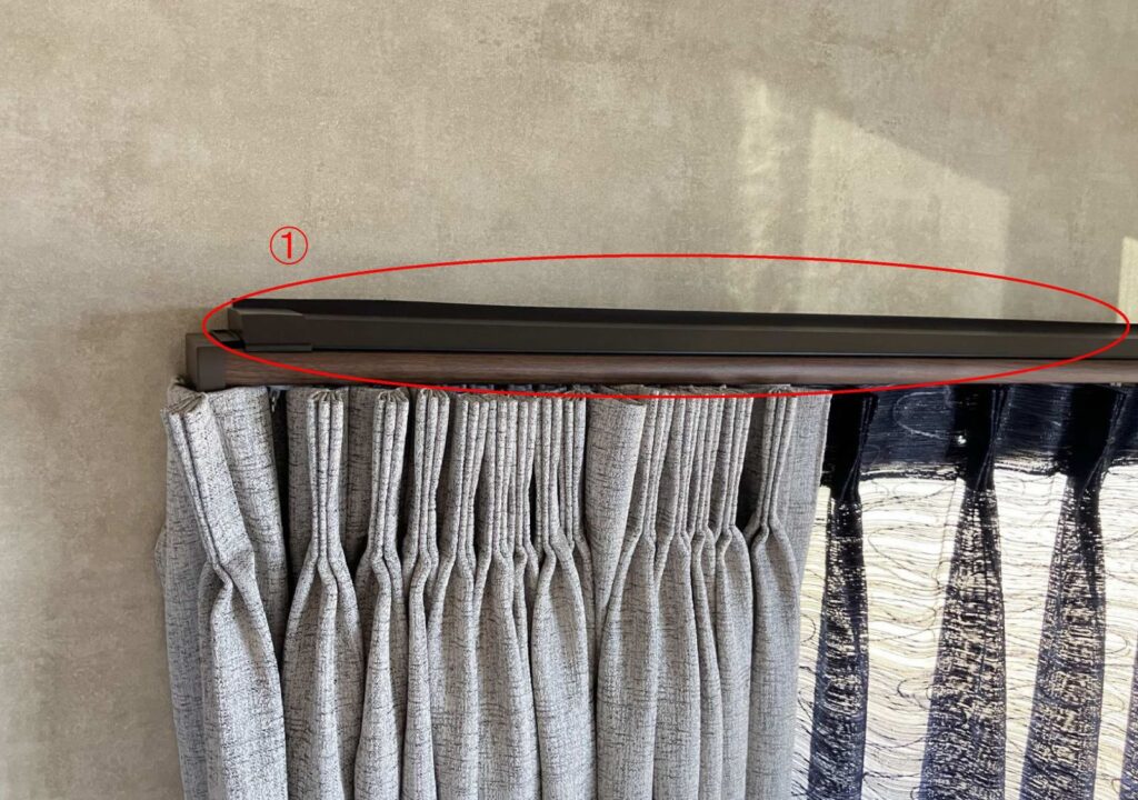 ①カーテンレールの上面にカーテンレール専用部材 カバートップを置き、すき間をシャットアウト (TOSOネクスティ使用)